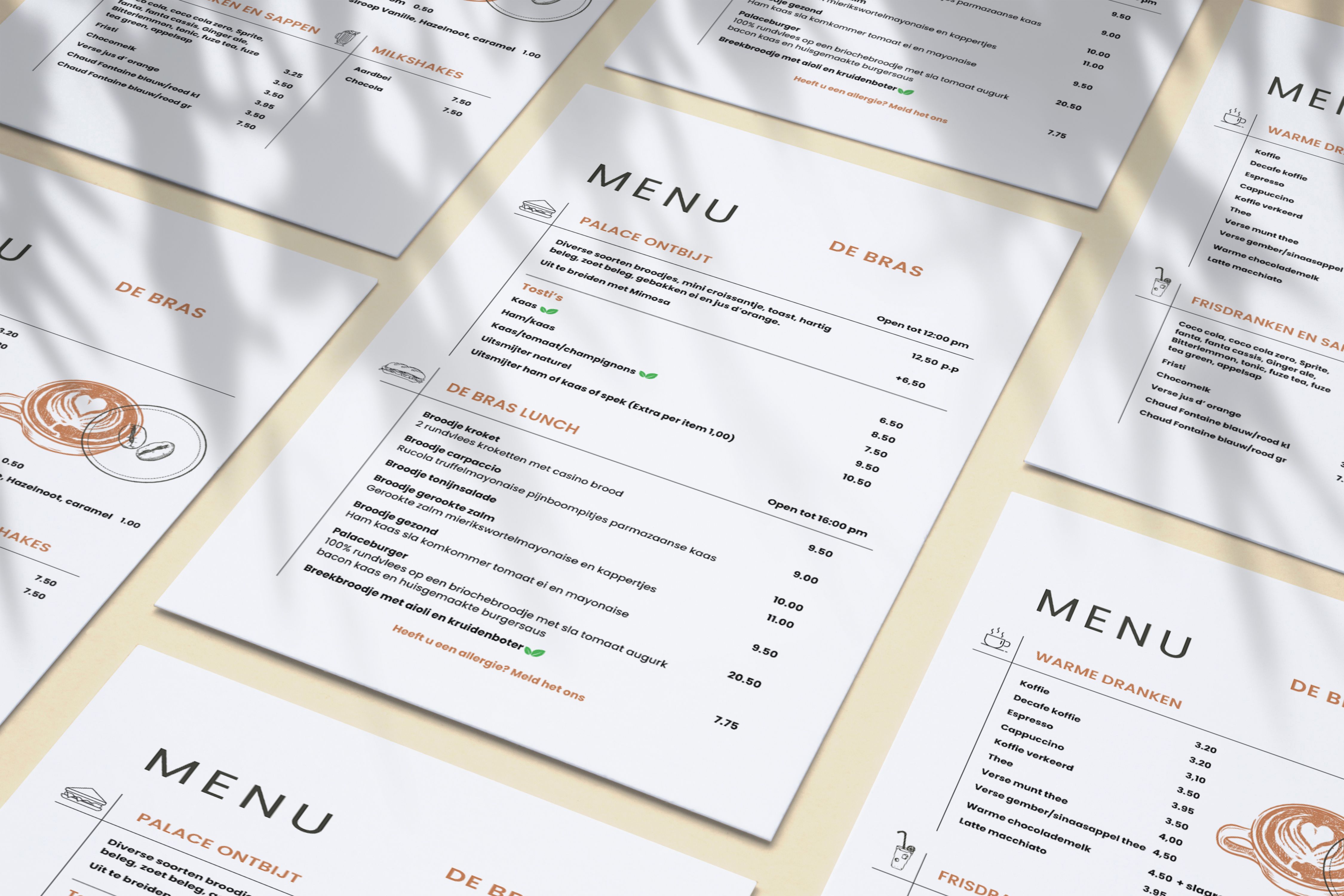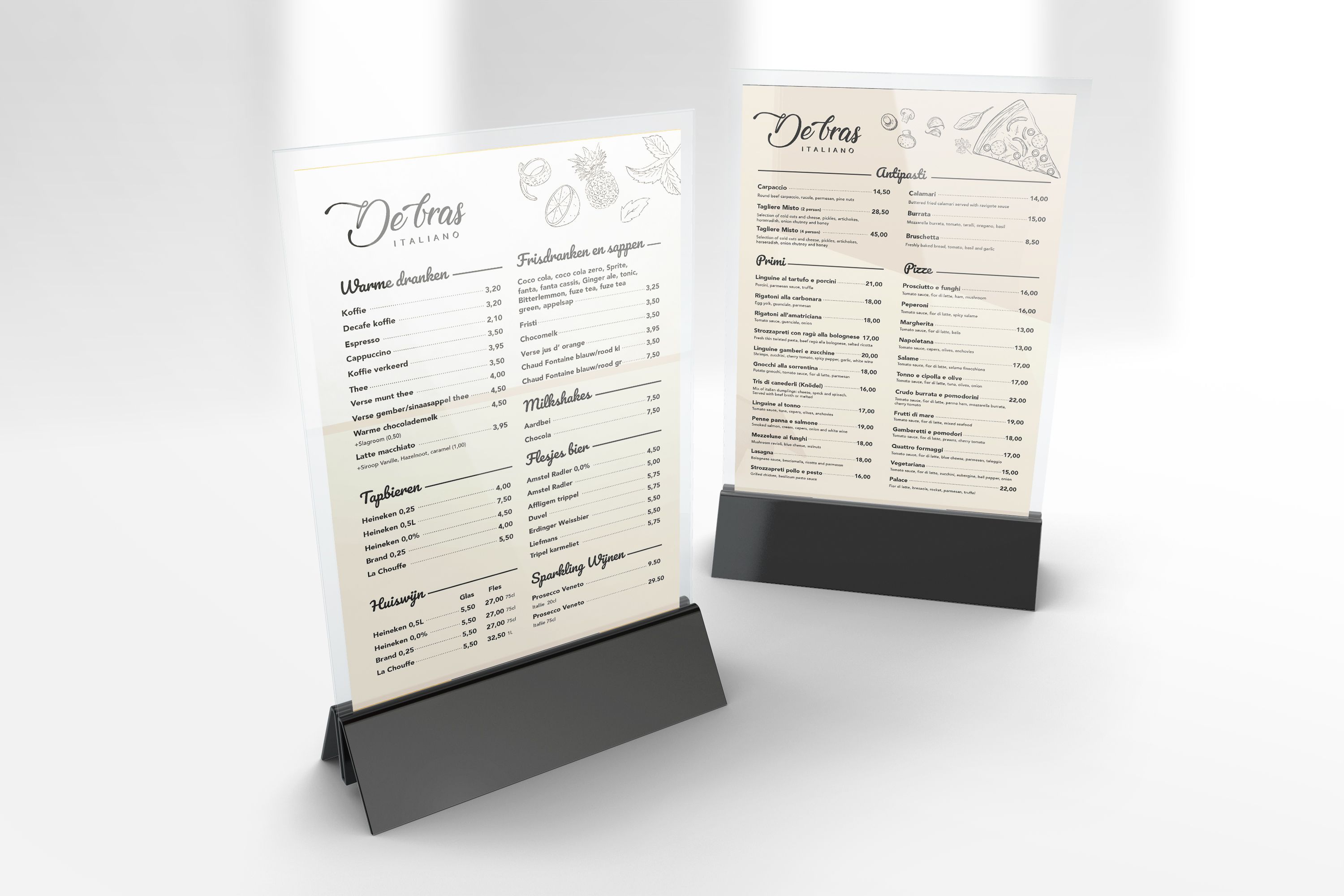 De Bras is een brasserie gevestigd in de scheveningse badplaats waar men kan eten en drinken. Wij hebben de opdracht gekregen om een nieuwe menu kaart te ontwerpen. De focus lag op een simpel, leesbaar en duidelijke menu dit vooral, omdat de doelgroep van de brasserie grotendeels boven 50 jaar is. Een bestaand restaurant in scheveningen maakt gebruik van de grote keuken en ruimte waarover ze beschikken en hebben een deel van de keuken en het restaurant ingericht voor traditionele italiaanse pastas en pizza’s. Het idee was een duidelijk en overzichtelijk menu kaart. Vanwege het compacte menu is er gekozen om de gerechten op 1 zijde neer te zetten. Hetzelfde idee is ook gekozen voor de drankenlijst.